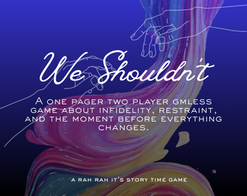 We Shouldn't is a single page two player gmless game about infidelity, restraint, and the moment before everything changes. It requires one 12 sided dice.